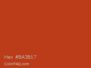 Hex #ba3b17 Color is a normal red color and the nearest color is Rust #b7410e. Hex code #ba3b17 and RGB value is rgb(186,59,23). In RGB color space, this color is composed of 73% red, 23% green, 9% blue, In CMYK color space, this color is composed of 0% cyan, 68% magenta, 88% yellow , 27% black , In HSL color space, this color has a hue angle of 13° , 78% saturation and 41% lightness.
