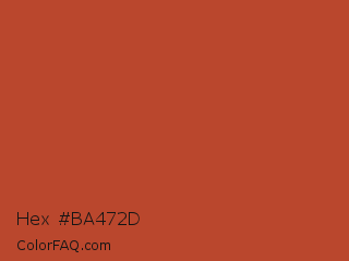 Hex #ba472d Color is a normal red color and the nearest color is Mojo #c04737. Hex code #ba472d and RGB value is rgb(186,71,45). In RGB color space, this color is composed of 73% red, 28% green, 18% blue, In CMYK color space, this color is composed of 0% cyan, 62% magenta, 76% yellow , 27% black , In HSL color space, this color has a hue angle of 11° , 61% saturation and 45% lightness.