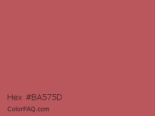 Hex #ba575d Color is a normal red color and the nearest color is Popstar #be4f62. Hex code #ba575d and RGB value is rgb(186,87,93). In RGB color space, this color is composed of 73% red, 34% green, 36% blue, In CMYK color space, this color is composed of 0% cyan, 53% magenta, 50% yellow , 27% black , In HSL color space, this color has a hue angle of 356° , 42% saturation and 54% lightness.