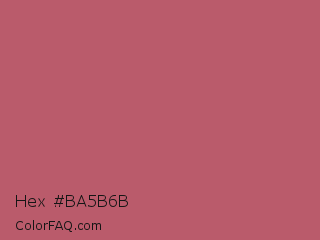 Hex #ba5b6b Color is a normal red color and the nearest color is Popstar #be4f62. Hex code #ba5b6b and RGB value is rgb(186,91,107). In RGB color space, this color is composed of 73% red, 36% green, 42% blue, In CMYK color space, this color is composed of 0% cyan, 51% magenta, 42% yellow , 27% black , In HSL color space, this color has a hue angle of 350° , 41% saturation and 54% lightness.