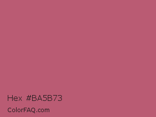 Hex #ba5b73 Color is a normal red color and the nearest color is Tapestry #b05e81. Hex code #ba5b73 and RGB value is rgb(186,91,115). In RGB color space, this color is composed of 73% red, 36% green, 45% blue, In CMYK color space, this color is composed of 0% cyan, 51% magenta, 38% yellow , 27% black , In HSL color space, this color has a hue angle of 345° , 41% saturation and 54% lightness.