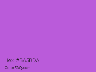 Hex #ba5bda Color is a light purple color and the nearest color is Medium Orchid #ba55d3. Hex code #ba5bda and RGB value is rgb(186,91,218). In RGB color space, this color is composed of 73% red, 36% green, 85% blue, In CMYK color space, this color is composed of 15% cyan, 58% magenta, 0% yellow , 15% black , In HSL color space, this color has a hue angle of 285° , 63% saturation and 61% lightness.