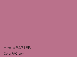 Hex #ba718b Color is a normal rose color and the nearest color is Turkish Rose #b57281. Hex code #ba718b and RGB value is rgb(186,113,139). In RGB color space, this color is composed of 73% red, 44% green, 55% blue, In CMYK color space, this color is composed of 0% cyan, 39% magenta, 25% yellow , 27% black , In HSL color space, this color has a hue angle of 339° , 35% saturation and 59% lightness.