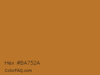Hex #ba752a Color is a normal orange color and the nearest color is Liver Dogs #b86d29. Hex code #ba752a and RGB value is rgb(186,117,42). In RGB color space, this color is composed of 73% red, 46% green, 16% blue, In CMYK color space, this color is composed of 0% cyan, 37% magenta, 77% yellow , 27% black , In HSL color space, this color has a hue angle of 31° , 63% saturation and 45% lightness.