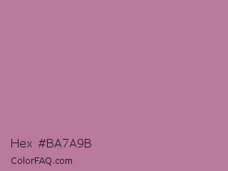 Hex #ba7a9b Color is a normal rose color and the nearest color is English Lavender #b48395. Hex code #ba7a9b and RGB value is rgb(186,122,155). In RGB color space, this color is composed of 73% red, 48% green, 61% blue, In CMYK color space, this color is composed of 0% cyan, 34% magenta, 17% yellow , 27% black , In HSL color space, this color has a hue angle of 329° , 32% saturation and 60% lightness.
