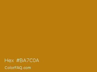 Hex #ba7c0a Color is a normal orange color and the nearest color is Pirate Gold #ba7f03. Hex code #ba7c0a and RGB value is rgb(186,124,10). In RGB color space, this color is composed of 73% red, 49% green, 4% blue, In CMYK color space, this color is composed of 0% cyan, 33% magenta, 95% yellow , 27% black , In HSL color space, this color has a hue angle of 39° , 90% saturation and 38% lightness.