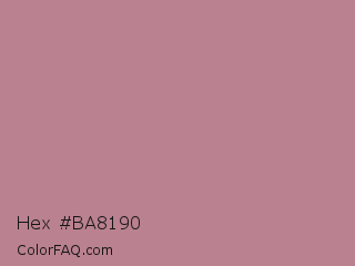 Hex #ba8190 Color is a light rose color and the nearest color is English Lavender #b48395. Hex code #ba8190 and RGB value is rgb(186,129,144). In RGB color space, this color is composed of 73% red, 51% green, 56% blue, In CMYK color space, this color is composed of 0% cyan, 31% magenta, 23% yellow , 27% black , In HSL color space, this color has a hue angle of 344° , 29% saturation and 62% lightness.