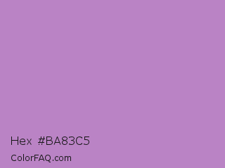 Hex #ba83c5 Color is a light purple color and the nearest color is African Violet #b284be. Hex code #ba83c5 and RGB value is rgb(186,131,197). In RGB color space, this color is composed of 73% red, 51% green, 77% blue, In CMYK color space, this color is composed of 6% cyan, 34% magenta, 0% yellow , 23% black , In HSL color space, this color has a hue angle of 290° , 36% saturation and 64% lightness.