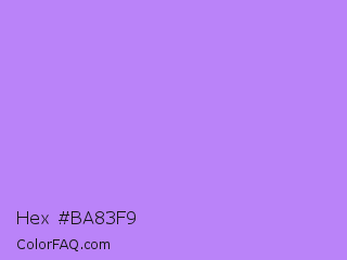 Hex #ba83f9 Color is a light violet color and the nearest color is Bright Lavender #bf94e4. Hex code #ba83f9 and RGB value is rgb(186,131,249). In RGB color space, this color is composed of 73% red, 51% green, 98% blue, In CMYK color space, this color is composed of 25% cyan, 47% magenta, 0% yellow , 2% black , In HSL color space, this color has a hue angle of 268° , 91% saturation and 75% lightness.
