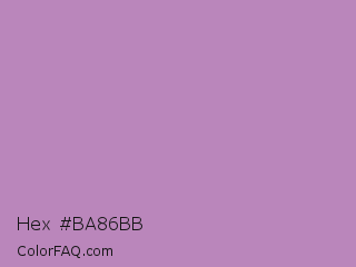 Hex #ba86bb Color is a light magenta color and the nearest color is African Violet #b284be. Hex code #ba86bb and RGB value is rgb(186,134,187). In RGB color space, this color is composed of 73% red, 53% green, 73% blue, In CMYK color space, this color is composed of 1% cyan, 28% magenta, 0% yellow , 27% black , In HSL color space, this color has a hue angle of 299° , 28% saturation and 63% lightness.