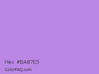 Hex #ba87e5 Color is a light purple color and the nearest color is Lavender #b57edc. Hex code #ba87e5 and RGB value is rgb(186,135,229). In RGB color space, this color is composed of 73% red, 53% green, 90% blue, In CMYK color space, this color is composed of 19% cyan, 41% magenta, 0% yellow , 10% black , In HSL color space, this color has a hue angle of 273° , 64% saturation and 71% lightness.
