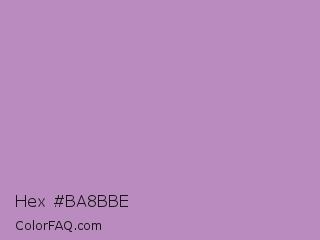 Hex #ba8bbe Color is a light magenta color and the nearest color is African Violet #b284be. Hex code #ba8bbe and RGB value is rgb(186,139,190). In RGB color space, this color is composed of 73% red, 55% green, 75% blue, In CMYK color space, this color is composed of 2% cyan, 27% magenta, 0% yellow , 25% black , In HSL color space, this color has a hue angle of 295° , 28% saturation and 65% lightness.