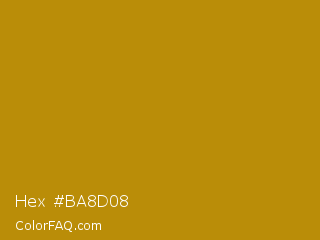 Hex #ba8d08 Color is a normal orange color and the nearest color is Dark Goldenrod #b8860b. Hex code #ba8d08 and RGB value is rgb(186,141,8). In RGB color space, this color is composed of 73% red, 55% green, 3% blue, In CMYK color space, this color is composed of 0% cyan, 24% magenta, 96% yellow , 27% black , In HSL color space, this color has a hue angle of 45° , 92% saturation and 38% lightness.