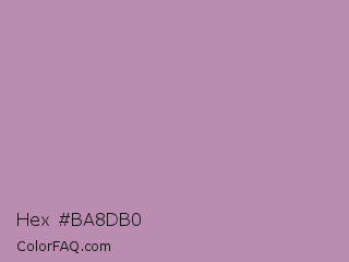 Hex #ba8db0 Color is a light magenta color and the nearest color is Opera Mauve #b784a7. Hex code #ba8db0 and RGB value is rgb(186,141,176). In RGB color space, this color is composed of 73% red, 55% green, 69% blue, In CMYK color space, this color is composed of 0% cyan, 24% magenta, 5% yellow , 27% black , In HSL color space, this color has a hue angle of 313° , 25% saturation and 64% lightness.