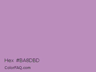 Hex #ba8dbd Color is a light magenta color and the nearest color is African Violet #b284be. Hex code #ba8dbd and RGB value is rgb(186,141,189). In RGB color space, this color is composed of 73% red, 55% green, 74% blue, In CMYK color space, this color is composed of 2% cyan, 25% magenta, 0% yellow , 26% black , In HSL color space, this color has a hue angle of 296° , 27% saturation and 65% lightness.