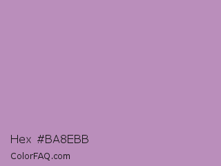 Hex #ba8ebb Color is a light magenta color and the nearest color is African Violet #b284be. Hex code #ba8ebb and RGB value is rgb(186,142,187). In RGB color space, this color is composed of 73% red, 56% green, 73% blue, In CMYK color space, this color is composed of 1% cyan, 24% magenta, 0% yellow , 27% black , In HSL color space, this color has a hue angle of 299° , 25% saturation and 65% lightness.