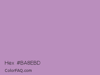 Hex #ba8ebd Color is a light magenta color and the nearest color is African Violet #b284be. Hex code #ba8ebd and RGB value is rgb(186,142,189). In RGB color space, this color is composed of 73% red, 56% green, 74% blue, In CMYK color space, this color is composed of 2% cyan, 25% magenta, 0% yellow , 26% black , In HSL color space, this color has a hue angle of 296° , 26% saturation and 65% lightness.