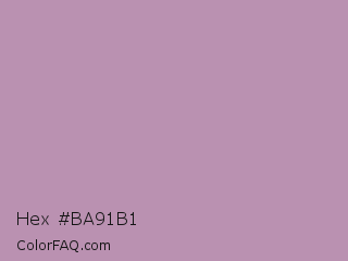 Hex #ba91b1 Color is a light magenta color and the nearest color is Glossy Grape #ab92b3. Hex code #ba91b1 and RGB value is rgb(186,145,177). In RGB color space, this color is composed of 73% red, 57% green, 69% blue, In CMYK color space, this color is composed of 0% cyan, 22% magenta, 5% yellow , 27% black , In HSL color space, this color has a hue angle of 313° , 23% saturation and 65% lightness.