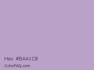 Hex #baa1c8 Color is a light purple color and the nearest color is London Hue #bea6c3. Hex code #baa1c8 and RGB value is rgb(186,161,200). In RGB color space, this color is composed of 73% red, 63% green, 78% blue, In CMYK color space, this color is composed of 7% cyan, 20% magenta, 0% yellow , 22% black , In HSL color space, this color has a hue angle of 278° , 26% saturation and 71% lightness.