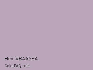 Hex #baa6ba Color is a light magenta color and the nearest color is London Hue #bea6c3. Hex code #baa6ba and RGB value is rgb(186,166,186). In RGB color space, this color is composed of 73% red, 65% green, 73% blue, In CMYK color space, this color is composed of 0% cyan, 11% magenta, 0% yellow , 27% black , In HSL color space, this color has a hue angle of 300° , 13% saturation and 69% lightness.