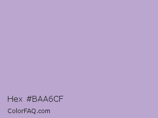 Hex #baa6cf Color is a light violet color and the nearest color is London Hue #bea6c3. Hex code #baa6cf and RGB value is rgb(186,166,207). In RGB color space, this color is composed of 73% red, 65% green, 81% blue, In CMYK color space, this color is composed of 10% cyan, 20% magenta, 0% yellow , 19% black , In HSL color space, this color has a hue angle of 269° , 30% saturation and 73% lightness.