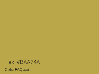Hex #baa74a Color is a normal yellow color and the nearest color is Brass #b5a642. Hex code #baa74a and RGB value is rgb(186,167,74). In RGB color space, this color is composed of 73% red, 65% green, 29% blue, In CMYK color space, this color is composed of 0% cyan, 10% magenta, 60% yellow , 27% black , In HSL color space, this color has a hue angle of 50° , 45% saturation and 51% lightness.