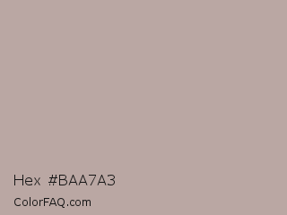Hex #baa7a3 Color is a light red color and the nearest color is Nomad #bab1a2. Hex code #baa7a3 and RGB value is rgb(186,167,163). In RGB color space, this color is composed of 73% red, 65% green, 64% blue, In CMYK color space, this color is composed of 0% cyan, 10% magenta, 12% yellow , 27% black , In HSL color space, this color has a hue angle of 10° , 14% saturation and 68% lightness.