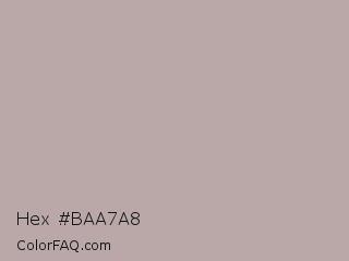 Hex #baa7a8 Color is a light red color and the nearest color is Silk #bdb1a8. Hex code #baa7a8 and RGB value is rgb(186,167,168). In RGB color space, this color is composed of 73% red, 65% green, 66% blue, In CMYK color space, this color is composed of 0% cyan, 10% magenta, 10% yellow , 27% black , In HSL color space, this color has a hue angle of 357° , 12% saturation and 69% lightness.