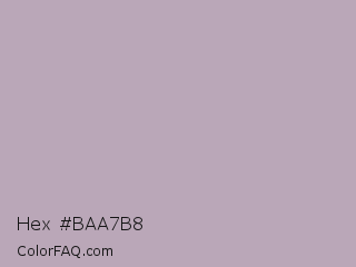 Hex #baa7b8 Color is a light magenta color and the nearest color is Black Shadows #bfafb2. Hex code #baa7b8 and RGB value is rgb(186,167,184). In RGB color space, this color is composed of 73% red, 65% green, 72% blue, In CMYK color space, this color is composed of 0% cyan, 10% magenta, 1% yellow , 27% black , In HSL color space, this color has a hue angle of 306° , 12% saturation and 69% lightness.