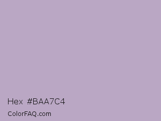 Hex #baa7c4 Color is a light purple color and the nearest color is London Hue #bea6c3. Hex code #baa7c4 and RGB value is rgb(186,167,196). In RGB color space, this color is composed of 73% red, 65% green, 77% blue, In CMYK color space, this color is composed of 5% cyan, 15% magenta, 0% yellow , 23% black , In HSL color space, this color has a hue angle of 279° , 20% saturation and 71% lightness.