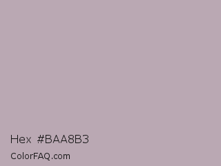 Hex #baa8b3 Color is a light magenta color and the nearest color is Black Shadows #bfafb2. Hex code #baa8b3 and RGB value is rgb(186,168,179). In RGB color space, this color is composed of 73% red, 66% green, 70% blue, In CMYK color space, this color is composed of 0% cyan, 10% magenta, 4% yellow , 27% black , In HSL color space, this color has a hue angle of 323° , 12% saturation and 69% lightness.