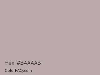 Hex #baaaab Color is a light red color and the nearest color is Silk #bdb1a8. Hex code #baaaab and RGB value is rgb(186,170,171). In RGB color space, this color is composed of 73% red, 67% green, 67% blue, In CMYK color space, this color is composed of 0% cyan, 9% magenta, 8% yellow , 27% black , In HSL color space, this color has a hue angle of 356° , 10% saturation and 70% lightness.