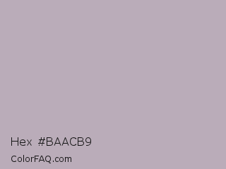 Hex #baacb9 Color is a light magenta color and the nearest color is Black Shadows #bfafb2. Hex code #baacb9 and RGB value is rgb(186,172,185). In RGB color space, this color is composed of 73% red, 67% green, 73% blue, In CMYK color space, this color is composed of 0% cyan, 8% magenta, 1% yellow , 27% black , In HSL color space, this color has a hue angle of 304° , 9% saturation and 70% lightness.