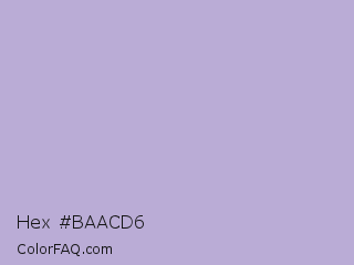 Hex #baacd6 Color is a light indigo color and the nearest color is Lavender Gray #bdbbd7. Hex code #baacd6 and RGB value is rgb(186,172,214). In RGB color space, this color is composed of 73% red, 67% green, 84% blue, In CMYK color space, this color is composed of 13% cyan, 20% magenta, 0% yellow , 16% black , In HSL color space, this color has a hue angle of 260° , 34% saturation and 76% lightness.