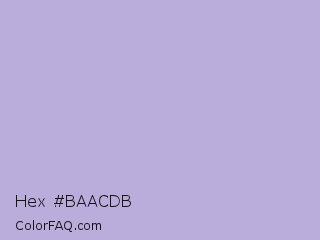 Hex #baacdb Color is a light indigo color and the nearest color is Lavender Gray #bdbbd7. Hex code #baacdb and RGB value is rgb(186,172,219). In RGB color space, this color is composed of 73% red, 67% green, 86% blue, In CMYK color space, this color is composed of 15% cyan, 21% magenta, 0% yellow , 14% black , In HSL color space, this color has a hue angle of 258° , 39% saturation and 77% lightness.