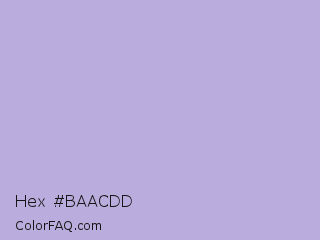 Hex #baacdd Color is a light indigo color and the nearest color is Lavender Gray #bdbbd7. Hex code #baacdd and RGB value is rgb(186,172,221). In RGB color space, this color is composed of 73% red, 67% green, 87% blue, In CMYK color space, this color is composed of 16% cyan, 22% magenta, 0% yellow , 13% black , In HSL color space, this color has a hue angle of 257° , 42% saturation and 77% lightness.