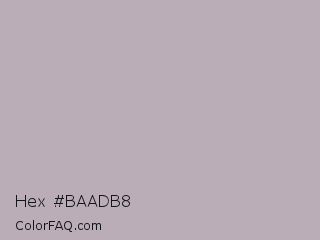 Hex #baadb8 Color is a light magenta color and the nearest color is Black Shadows #bfafb2. Hex code #baadb8 and RGB value is rgb(186,173,184). In RGB color space, this color is composed of 73% red, 68% green, 72% blue, In CMYK color space, this color is composed of 0% cyan, 7% magenta, 1% yellow , 27% black , In HSL color space, this color has a hue angle of 309° , 9% saturation and 70% lightness.