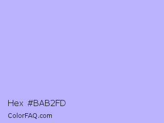 Hex #bab2fd Color is a very light indigo color and the nearest color is Melrose #c7c1ff. Hex code #bab2fd and RGB value is rgb(186,178,253). In RGB color space, this color is composed of 73% red, 70% green, 99% blue, In CMYK color space, this color is composed of 26% cyan, 30% magenta, 0% yellow , 1% black , In HSL color space, this color has a hue angle of 246° , 95% saturation and 85% lightness.