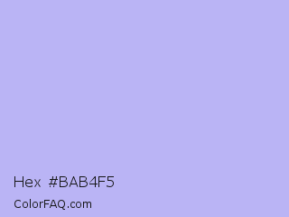 Hex #bab4f5 Color is a very light indigo color and the nearest color is Perano #a9bef2. Hex code #bab4f5 and RGB value is rgb(186,180,245). In RGB color space, this color is composed of 73% red, 71% green, 96% blue, In CMYK color space, this color is composed of 24% cyan, 27% magenta, 0% yellow , 4% black , In HSL color space, this color has a hue angle of 246° , 76% saturation and 83% lightness.