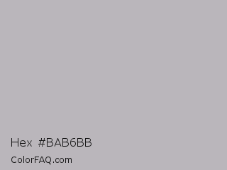 Hex #bab6bb Color is a light purple color and the nearest color is Pink Swan #beb5b7. Hex code #bab6bb and RGB value is rgb(186,182,187). In RGB color space, this color is composed of 73% red, 71% green, 73% blue, In CMYK color space, this color is composed of 1% cyan, 3% magenta, 0% yellow , 27% black , In HSL color space, this color has a hue angle of 288° , 4% saturation and 72% lightness.