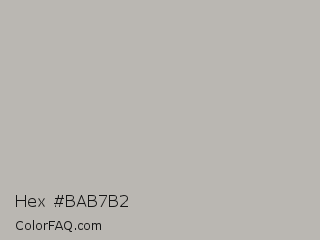 Hex #bab7b2 Color is a light orange color and the nearest color is Tide #bfb8b0. Hex code #bab7b2 and RGB value is rgb(186,183,178). In RGB color space, this color is composed of 73% red, 72% green, 70% blue, In CMYK color space, this color is composed of 0% cyan, 2% magenta, 4% yellow , 27% black , In HSL color space, this color has a hue angle of 38° , 5% saturation and 71% lightness.