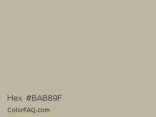 Hex #bab89f Color is a light yellow color and the nearest color is Eagle #b6baa4. Hex code #bab89f and RGB value is rgb(186,184,159). In RGB color space, this color is composed of 73% red, 72% green, 62% blue, In CMYK color space, this color is composed of 0% cyan, 1% magenta, 15% yellow , 27% black , In HSL color space, this color has a hue angle of 56° , 16% saturation and 68% lightness.