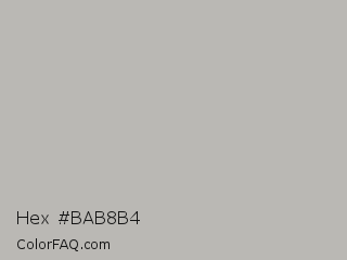 Hex #bab8b4 Color is a light orange color and the nearest color is Pink Swan #beb5b7. Hex code #bab8b4 and RGB value is rgb(186,184,180). In RGB color space, this color is composed of 73% red, 72% green, 71% blue, In CMYK color space, this color is composed of 0% cyan, 1% magenta, 3% yellow , 27% black , In HSL color space, this color has a hue angle of 40° , 4% saturation and 72% lightness.