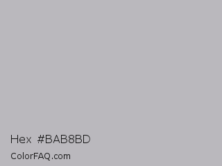 Hex #bab8bd Color is a light violet color and the nearest color is Gray X11 Gray #bebebe. Hex code #bab8bd and RGB value is rgb(186,184,189). In RGB color space, this color is composed of 73% red, 72% green, 74% blue, In CMYK color space, this color is composed of 2% cyan, 3% magenta, 0% yellow , 26% black , In HSL color space, this color has a hue angle of 264° , 4% saturation and 73% lightness.