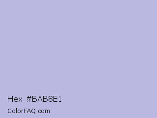 Hex #bab8e1 Color is a light indigo color and the nearest color is Lavender Gray #bdbbd7. Hex code #bab8e1 and RGB value is rgb(186,184,225). In RGB color space, this color is composed of 73% red, 72% green, 88% blue, In CMYK color space, this color is composed of 17% cyan, 18% magenta, 0% yellow , 12% black , In HSL color space, this color has a hue angle of 243° , 41% saturation and 80% lightness.