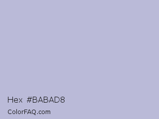 Hex #babad8 Color is a light blue color and the nearest color is Lavender Gray #bdbbd7. Hex code #babad8 and RGB value is rgb(186,186,216). In RGB color space, this color is composed of 73% red, 73% green, 85% blue, In CMYK color space, this color is composed of 14% cyan, 14% magenta, 0% yellow , 15% black , In HSL color space, this color has a hue angle of 240° , 28% saturation and 79% lightness.