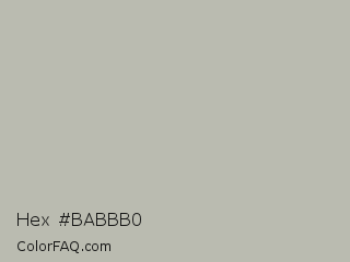 Hex #babbb0 Color is a light yellow color and the nearest color is Tide #bfb8b0. Hex code #babbb0 and RGB value is rgb(186,187,176). In RGB color space, this color is composed of 73% red, 73% green, 69% blue, In CMYK color space, this color is composed of 1% cyan, 0% magenta, 6% yellow , 27% black , In HSL color space, this color has a hue angle of 65° , 7% saturation and 71% lightness.