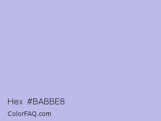 Hex #babbe8 Color is a very light blue color and the nearest color is Light Steel Blue #b0c4de. Hex code #babbe8 and RGB value is rgb(186,187,232). In RGB color space, this color is composed of 73% red, 73% green, 91% blue, In CMYK color space, this color is composed of 20% cyan, 19% magenta, 0% yellow , 9% black , In HSL color space, this color has a hue angle of 239° , 50% saturation and 82% lightness.
