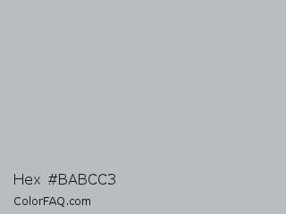 Hex #babcc3 Color is a light blue color and the nearest color is French Gray #bdbdc6. Hex code #babcc3 and RGB value is rgb(186,188,195). In RGB color space, this color is composed of 73% red, 74% green, 76% blue, In CMYK color space, this color is composed of 5% cyan, 4% magenta, 0% yellow , 24% black , In HSL color space, this color has a hue angle of 227° , 7% saturation and 75% lightness.