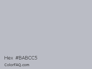 Hex #babcc5 Color is a light blue color and the nearest color is French Gray #bdbdc6. Hex code #babcc5 and RGB value is rgb(186,188,197). In RGB color space, this color is composed of 73% red, 74% green, 77% blue, In CMYK color space, this color is composed of 6% cyan, 5% magenta, 0% yellow , 23% black , In HSL color space, this color has a hue angle of 229° , 9% saturation and 75% lightness.
